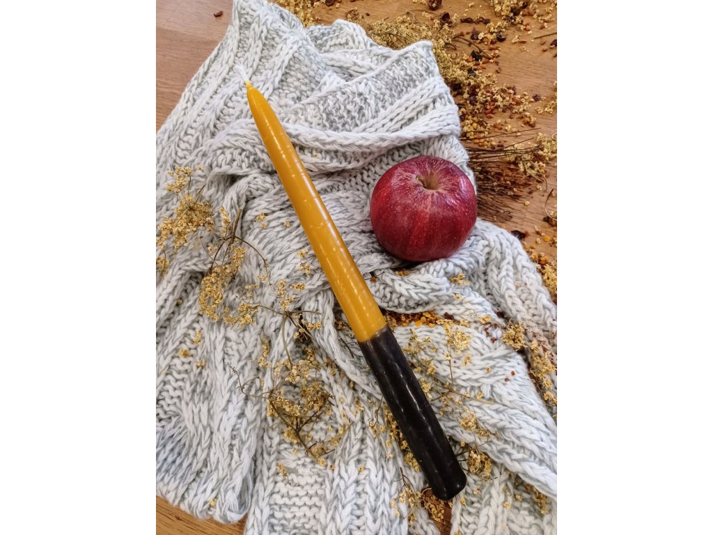 Krásná máčená svíčka ze 100% včelího vosku z kolekce Black and Yellow je ruční prací od začátku do konce. Je vytvořena starobylou technikou máčení knotu. Je vyrobena z včelího vosku od našich včel, přírodního pigmentu černé a 100% bavlněného knotu.