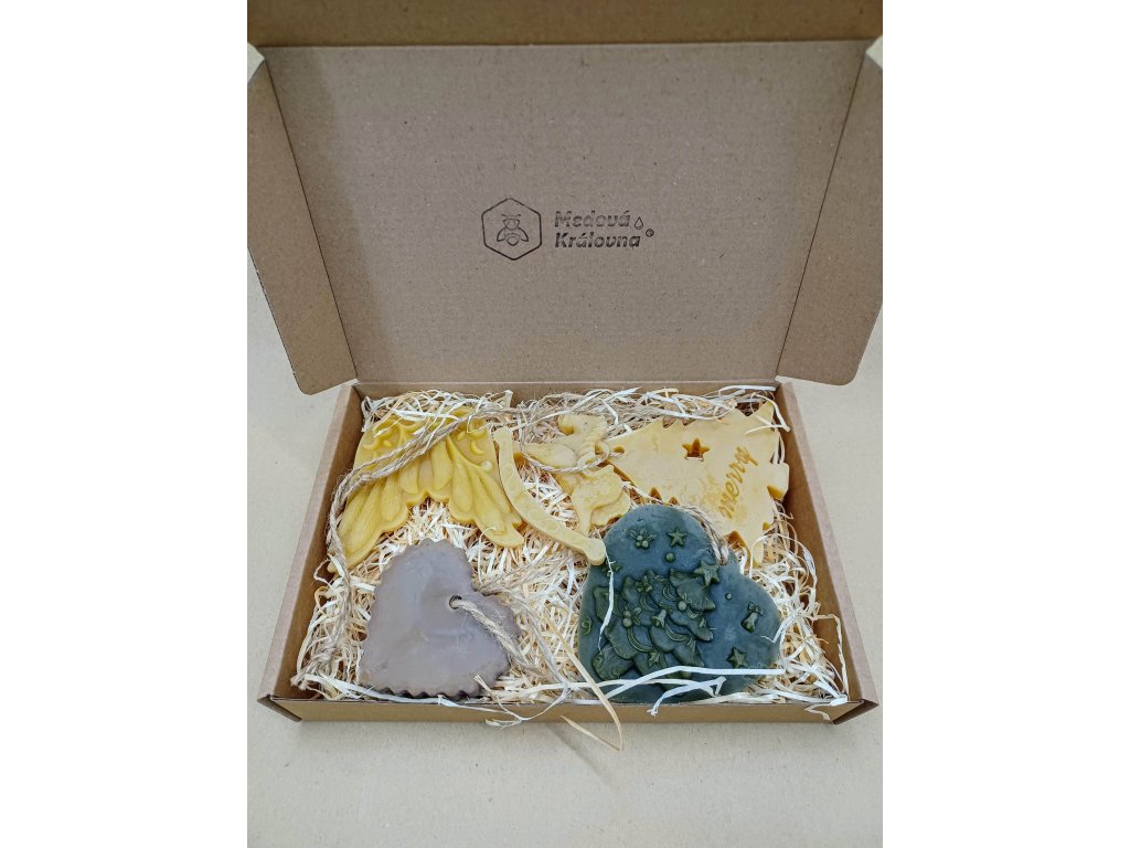 Rozměry: 5 x 6 cm (křídla), 8 x 6 cm (koník), 7,5 x 6,5 cm (stromeček), průměr 6,5 cm (srdíčko), průměr 6,5 cm (srdíčko se stromečkem)Gramáž: cca 20 g (křídla), cca 15 g (koník), cca 20 g (stromeček), cca 30 g (srdíčko), cca 30 g (srdíčko se stromečkem)Sada obsahuje: 5 ks ozdobV chladnějším prostředí se může na ozdobách tvořit bílý povlak tzv. voskový květ. Je přirozenou vlastností 100% včelího vosku a není na závadu. Snadno jej odstraníte jemným zahřátím ozdob např. dotekem, fénem nebo ponecháním v pokojové teplotě.