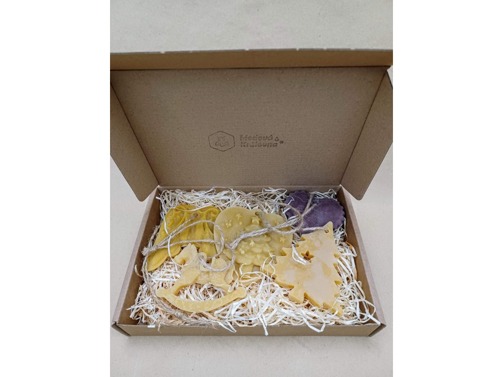 Sada kouzelných ozdob ze 100% včelího vosku Vánoční je ruční prací od začátku do konce. Jsou vyrobeny z včelího vosku od našich včel a opatřeny jutovým provázkem, aby jste si je mohli libovolně pověsit v místnosti nebo na vánoční stromeček. Při pokojové teplotě se uvolňuje jemná medová vůně. Jen je, prosím, nevystavujte přímému slunečnímu záření ani zdroji tepla.